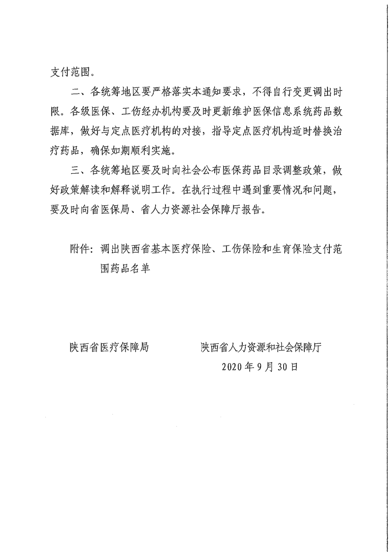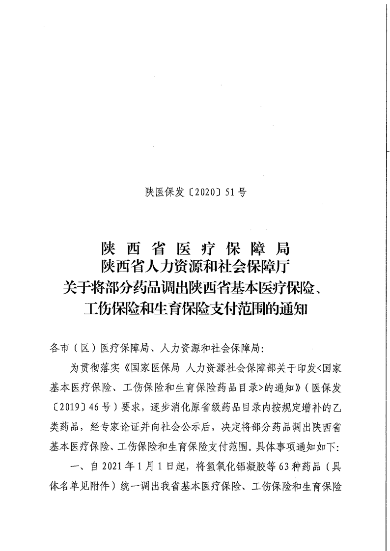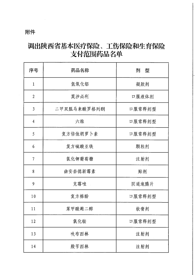 标题:陕西省医疗保障局 陕西省人力资源和社会保障厅 关于将部分药品调出陕西省基本医疗保险、工伤保险和生育保险支付范围的通知