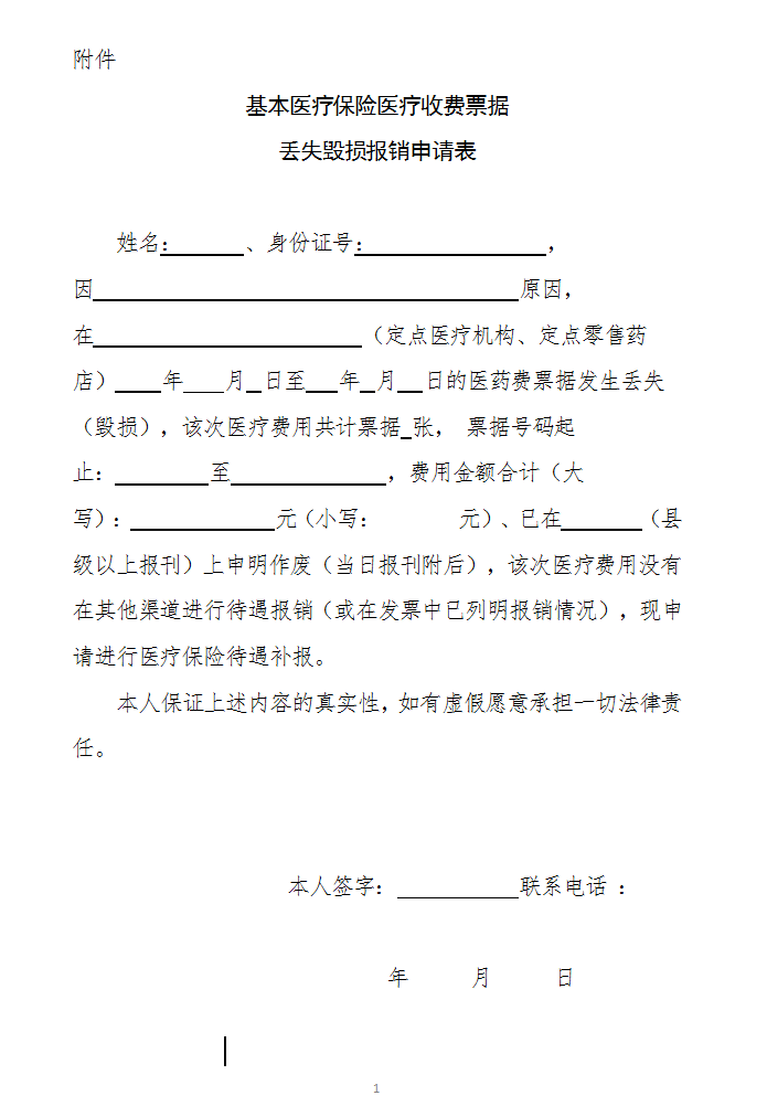 附件:《基本医疗保险医疗收费票据丢失毁损报销申请表》