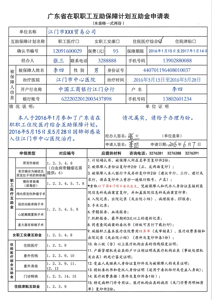 二、参加“住院医疗综合”的被保障人,在住院治疗结束、意外事故发生之日起,一年内通过所在单位工会,下载并填写《职工互助保障金申请表》,备齐申请表要求提供的资料,向江门代办处或各市(区)总工会代办点申请,经省互助会审批后,互助保障金直接划付至被保障人指定的银行账户。