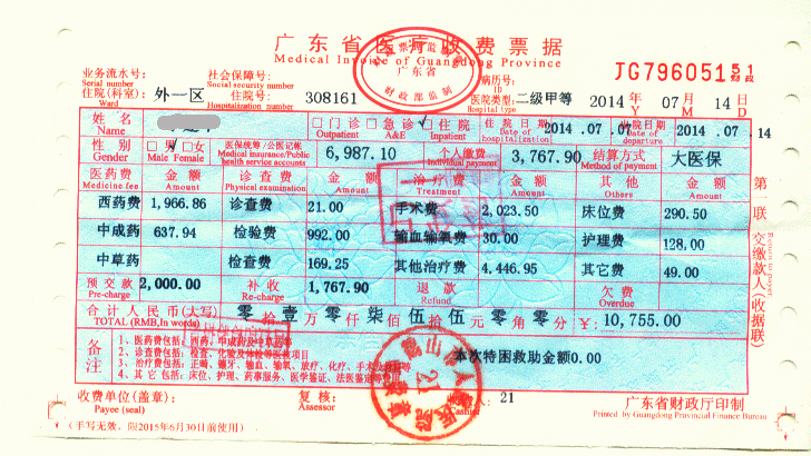 四、部分申请资料样板如下(住院费用结算单、医疗收费收据到医院收费处索取,其他资料直接到医院的信息科或病案室复印)