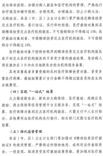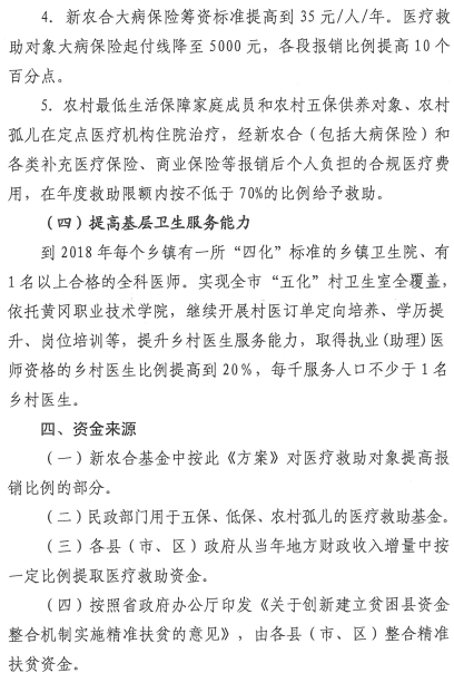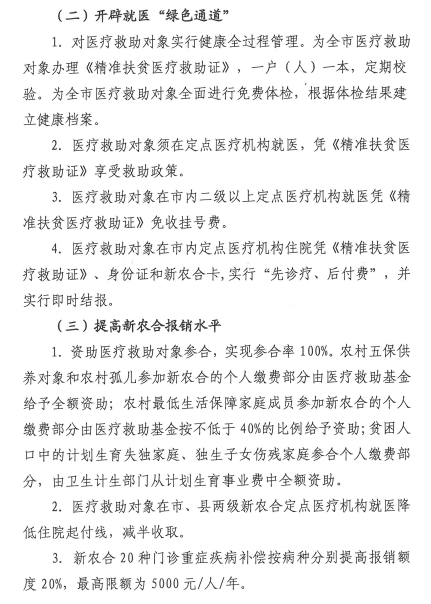 医疗救助对象在市、县两级新农合定点医疗机构就医降低住院起伏线,减半收取。新农合20种门诊重症疾病补偿按病种分别提高报销额度20%,最高限额为5000元/人/年。新农合大病保险筹资标准提高到35元/人/年。医疗救助对象大病保险起付线降至5000元,各段报销比例提高10个百分点。