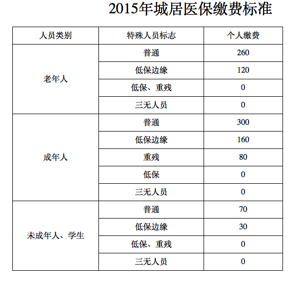 2015年城居医保缴费标准