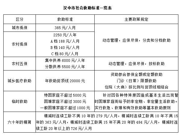 ①实施时间:2014年1月1日。②“分类施保”适用对象及补助标准:对城市低保对象中的“三无人员”,按低保标准的70%增发保障金;对低保家庭中的70周岁以上老年人,每人每月按低保标准的20%增发保障金;对低保家庭中的儿童,每人每月按低保标准的30%增发保障金;对低保家庭中的重度残疾人,盲人、严重低视力及智力残疾、精神残疾、一级肢体残疾者,每人每月按低保标准的50%增发保障金;对言语、听力、肢体残疾三级以上的残疾人,每人每月按低保标准的30%增发保障金;对低保家庭中的重病患者,每人每月按低保标准的50%增发保障金;对低保家庭中的单亲未成年人,如父母离异,每人每月按低保标准的30%增发保障金;如父母一方去世,每人每月按低保标准的50%增发保障金;对低保家庭中的哺乳期妇女,在哺乳期内,每人每月按低保标准的70%增发保障金;对低保家庭中的非义务教育阶段学生(不含学前教育),每人每月按低保标准的60%增发保障金;对上述低保对象同时符合上述多项条件的,按其中最高一项补助,不得同时享受。③汉中市分类施保补助标准。汉中市目前城市低保标准385元/人月,农村低保标准2250元/人年。例如:分类施保政策中“对低保家庭中的70周岁以上老年人,每人每月按低保标准的20%增发保障金”,即我市此类城市低保对象每人每月增发77元(385×20%),农村低保对象每人每月增发38元(2250/12×20%)。