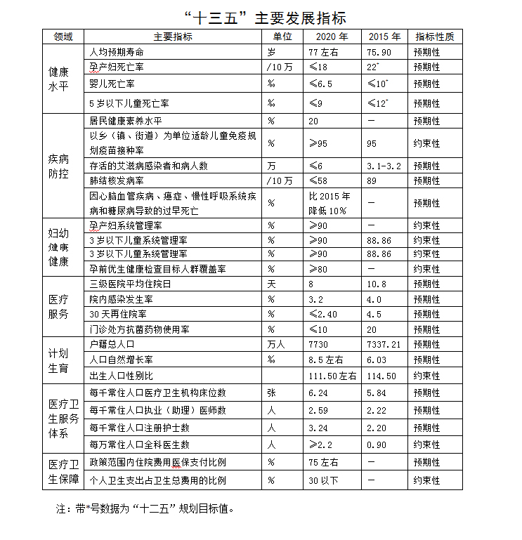到2020年,覆盖城乡居民的基本医疗卫生制度基本建立,实现人人享有基本医疗卫生服务,医疗卫生服务可及性、服务质量、服务效率和群众满意度显著提高,卫生资源配置和人群间健康状况差异不断缩小;社会力量办医的比例不断提高,多元化的办医格局基本形成;县级公立医院改革全面完成,省、市级公立医院改革稳步推进,个人就医负担明显减轻,基本实现全体人民病有所医;健康服务体系持续完善,城乡居民健康素养明显提升;分级诊疗与双向转诊良性机制基本形成,健康服务模式转变有效实现;全面两孩政策平稳实施,适度生育水平得到保持。