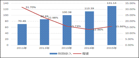 1.财政收入保持较快增长。我市积极巩固财源基础,稳步提升发展质量。2013年,财政总收入跻身全省“百亿俱乐部”。2014年提前完成“十二五”规划收入目标。2015年财政收入完成131.14亿元,是2010年的2.45倍,列全省市州第8位,比“十一五”末排名前移2个位次。全市财政总收入、地方财政收入年均增长19.62%、22.88%,分别高出全省平均水平3.2、4.4个百分点。县域财政收入总量由2010年的36.3亿元增加到2015年的99.6亿元,在全市的占比中提高了8个百分点。五个县区的财政收入突破10亿元关口。