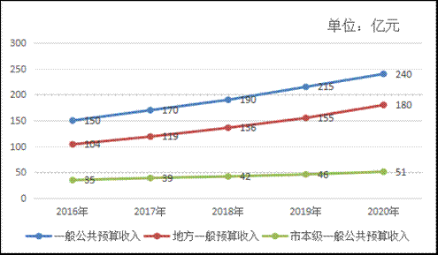 综合考量“十三五”时期国家政策导向、经济社会发展所处外部环境和我市发展阶段性特征,并与同期GDP年均8%以上增速相协调,推算2016-2020年我市一般公共预算收入年均增长12.85%,年度目标分别为:150亿元、170亿元、190亿元、215亿元、240亿元;2016-2020年我市地方财政收入年度目标分别为:104亿元、119亿元、136亿元、155亿元、180亿元,年均增长14%。