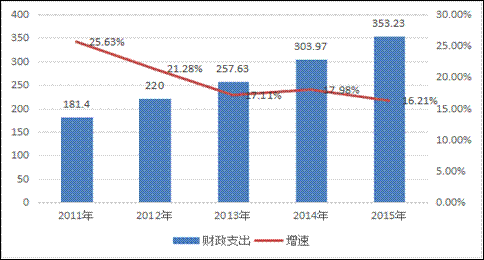 2.财政支出规模迅速扩大。随着财政实力的增强和争资立项成效的显现,全市财政保障和服务改革发展稳定大局的能力稳步提升。全市财支出总量由2010年的144.39亿元增长到2015年的353.23亿元,年均增长19.6%,是2010年的2.44倍,超过规划目标(年均增长17%)2个百分点,较全省平均增幅高出3.6个百分点。