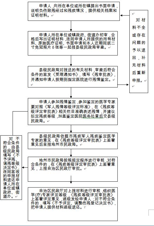 申请材料 | 1、新疆维吾尔自治区伤残人员评定(调整)或换证、补证报批表;2、个人伤残等级评定申请;3、本人身份、户口证明;4、地、州、市(县)民政部门评定伤残请示;5、单位、社区出具的伤残评定证明材料;6、规定医院出具的残情鉴定证明及住院病历材料(门诊病历、住院病历首页、入院记录、手术记录、出院小结和相关检查结果等复印材料) |