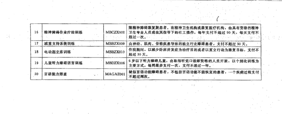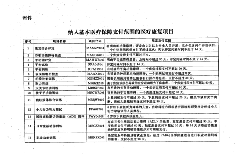 (一)将康复综合评定等20项医疗康复项目(见附件)纳入我市基本医疗保险支付范围,按照基本医疗保险规定的比例予以支付。