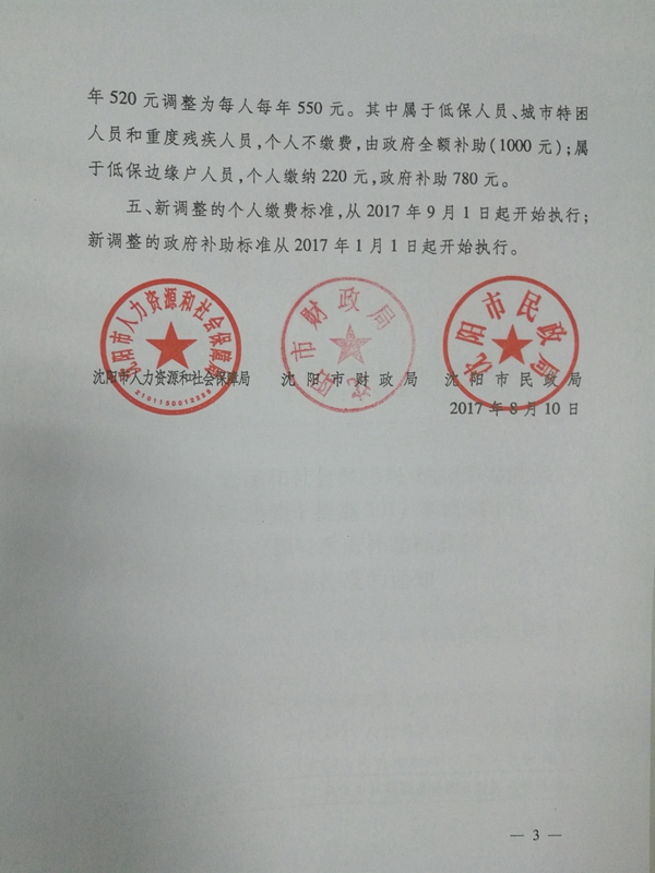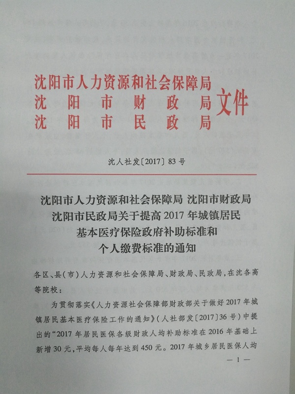 标题:沈阳市人力资源和社会保障局 沈阳市财政局 沈阳市民政局关于提高2017年城镇居民基本医疗保险政府补助标准和个人缴费标准的通知 沈人社发[2017]83号