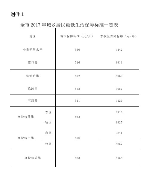 1、 全市 2017 年城乡居民最低生活保障标准一览表