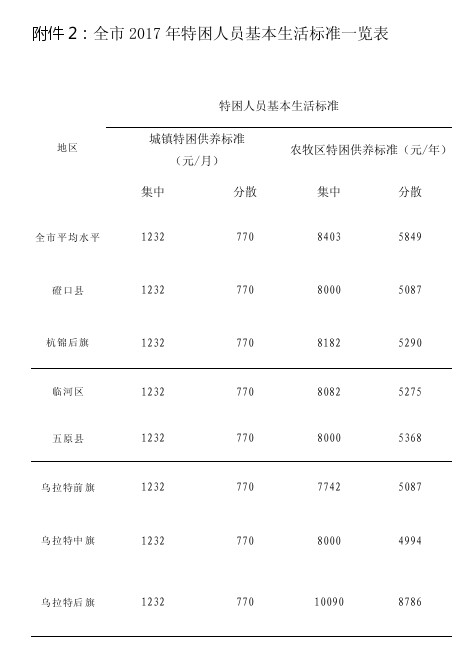 2、 全市 2017 年特困人员基本生活标准一览表
