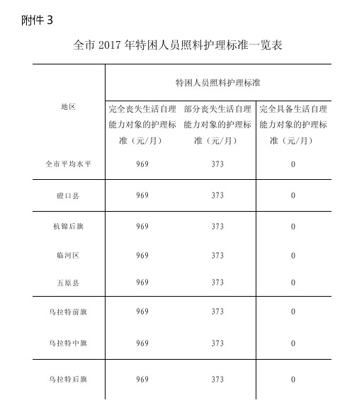 3、 全市 2017 年特困人员照料护理标准一览表