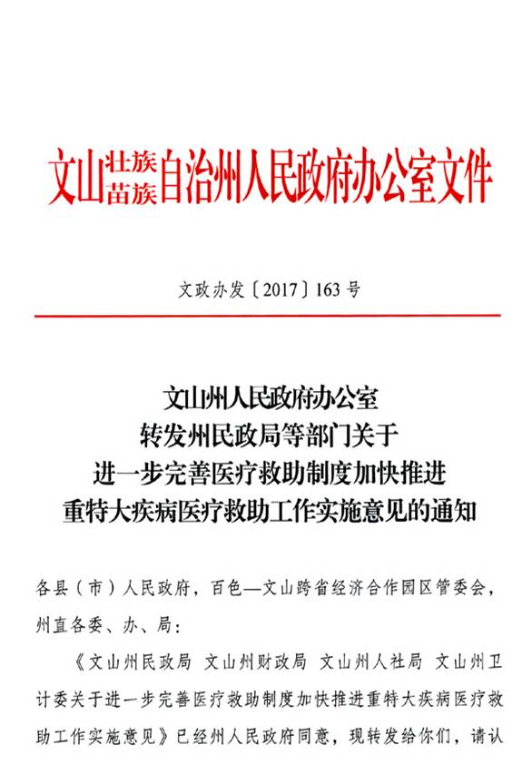根据《云南省人民政府办公厅转发省民政厅等部门关于进一步完善医疗救助制度加快推进重特大疾病医疗救助工作实施意见的通知》(云政办发〔2015〕65号)、《云南省财政厅云南省民政厅关于印发〈云南省重特大疾病医疗救助基金管理暂行办法〉的通知》(云财社〔2015〕329号)精神,为进一步完善医疗救助制度,健全社会救助体系,保障困难群众基本医疗权益,切实帮助解决贫困患者的医疗困难,结合文山州实际,现提出以下实施意见: