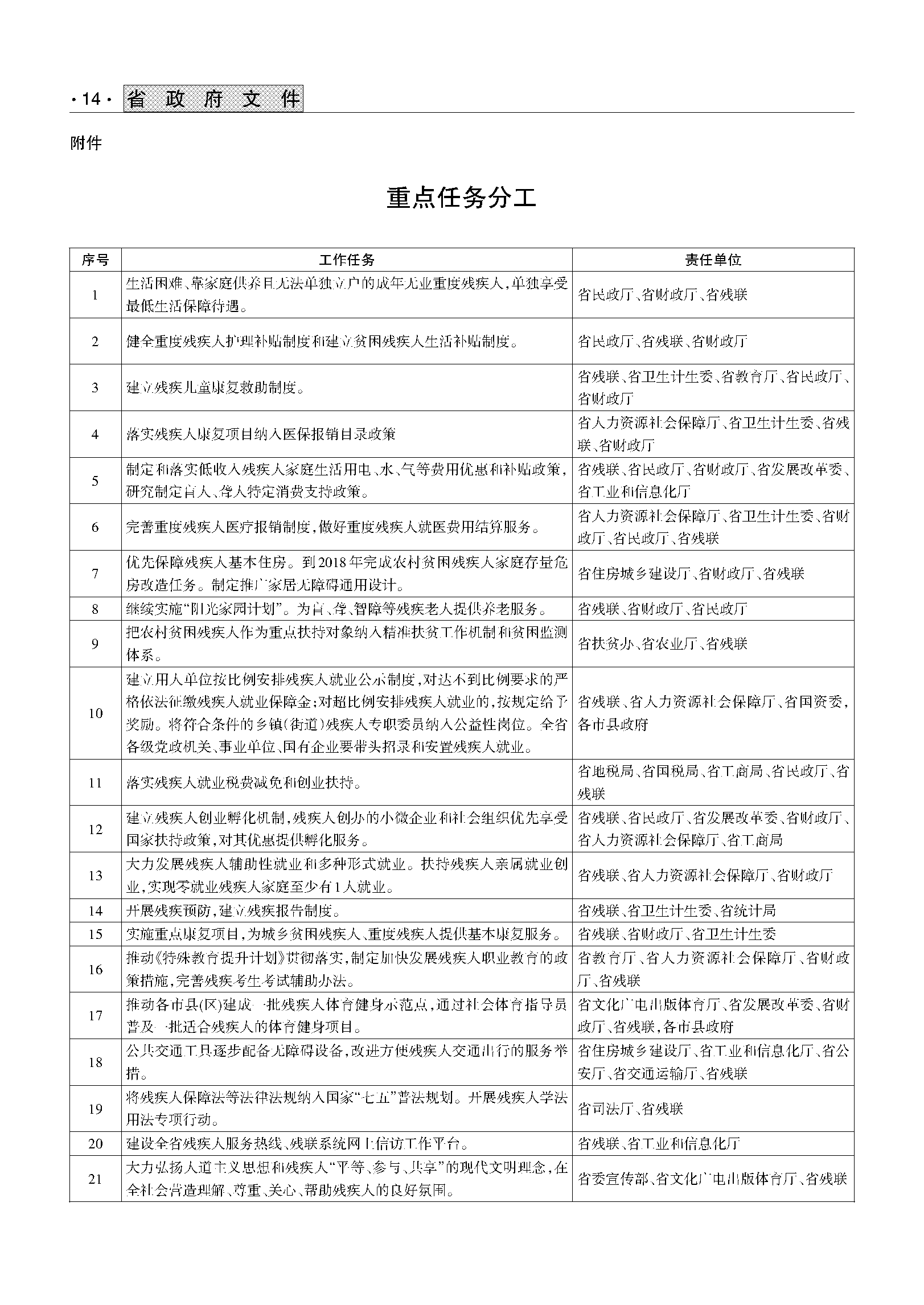 1.实施对贫困残疾人家庭的精准扶贫和精准脱贫。制定实施《海南省贫困残疾人脱贫攻坚行动计划(2016—2020年)》。把农村贫困残疾人作为重点扶持对象纳入精准扶贫工作机制和贫困监测体系,纳入建档立卡范围,分类施策。加强实用技术培训、社会化生产服务和金融信贷支持,充分发挥农民专业合作社、龙头企业和残疾人扶贫基地的辐射带动作用,确保有劳动力的农村贫困残疾人家庭至少有1名劳动力掌握1-2门实用技术。加强城乡劳动力资源信息对接与就业服务,有序组织农村残疾人转移就业。在资产收益扶贫工作中,财政专项资金形成的资产可折股量化优先配置给贫困残疾人家庭。积极引导贫困残疾人家庭采取土地托管或林权、农村土地承包经营权入股等方式,实现家庭资产增值增收。第一书记等驻村干部要将残疾人贫困户作为重点帮扶对象,选好配强帮扶责任人。将残疾人减贫成效纳入全省各级政府扶贫开发工作成效考核范围。