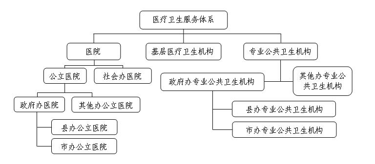 一、医疗卫生服务体系全市医疗卫生服务体系包括医院、基层医疗卫生机构和专业公共卫生机构等,各机构按照市、县(区)、乡镇(街道)、村四个层级梯度配置。医院分为公立医院和社会办医院,其中公立医院分为政府办医院(包括市办医院、县办医院二级)和其他公立医院(包括国有和集体企事业单位等举办的医院)。