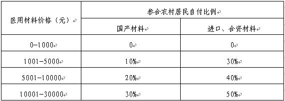 参合患者在定点医疗机构住院治疗必须使用按《贵州省医疗服务价格(2003)》和黔南州城市及县级公立医院综合改革部分医疗服务价格调整项目规定外另收费的单个医用材料,单价在1000 元以下的按新农合相关政策予以报销;单价在1001-30000元以下(含30000 元)的,按下表比例先行自付后,合规医药费用按新农合相关报销政策规定予以报销剩余费用;单价超过30000元的,超出30000元以上部分新农合不予报销。