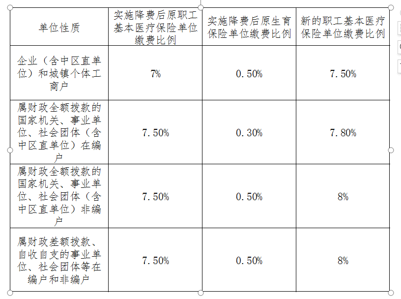 (一)职工基本医疗保险单位缴费比例详见下表: