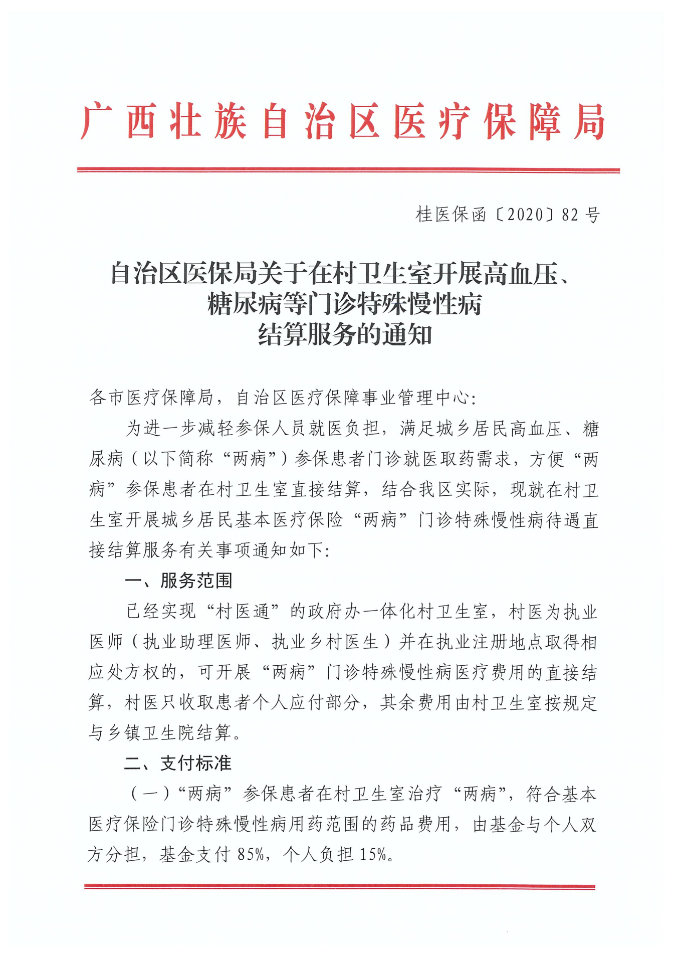 现将《自治区医保局关于在村卫生室开展高血压、糖尿病等门诊特殊慢性病结算服务的通知》(桂医保函〔2020〕83号)转发给你们,请认真贯彻执行。